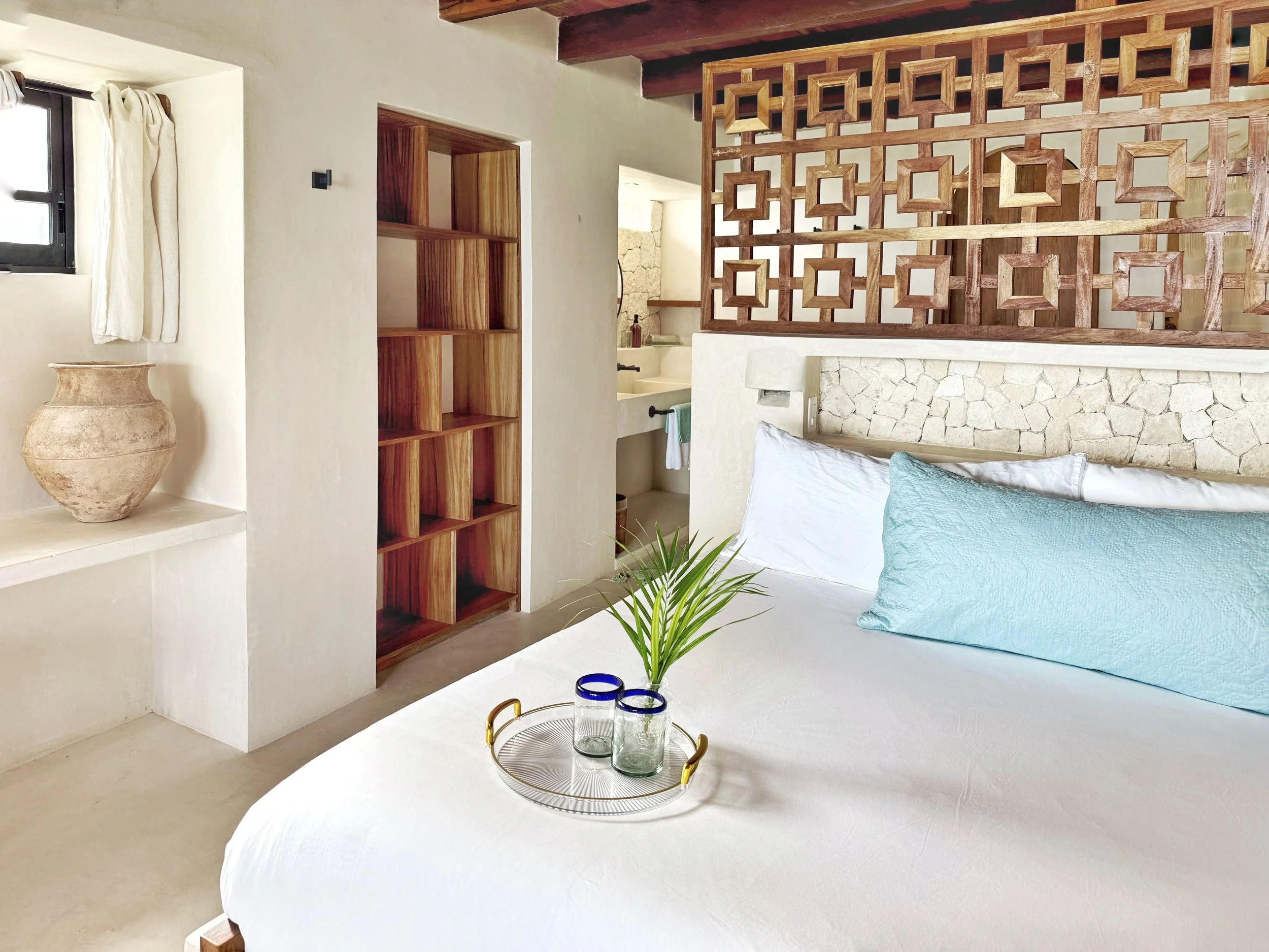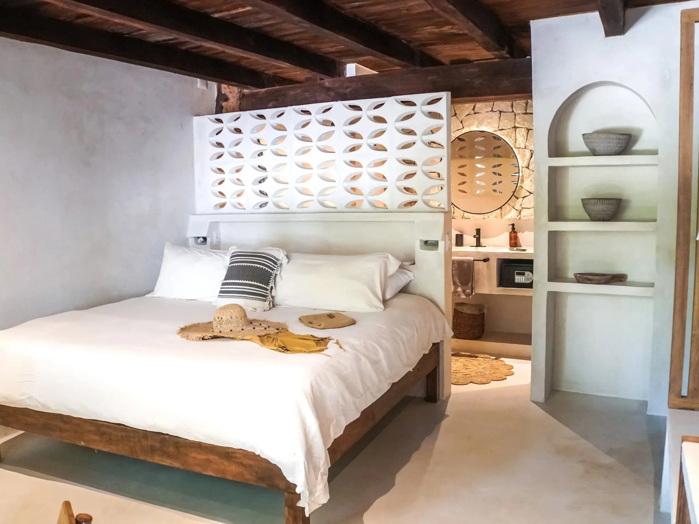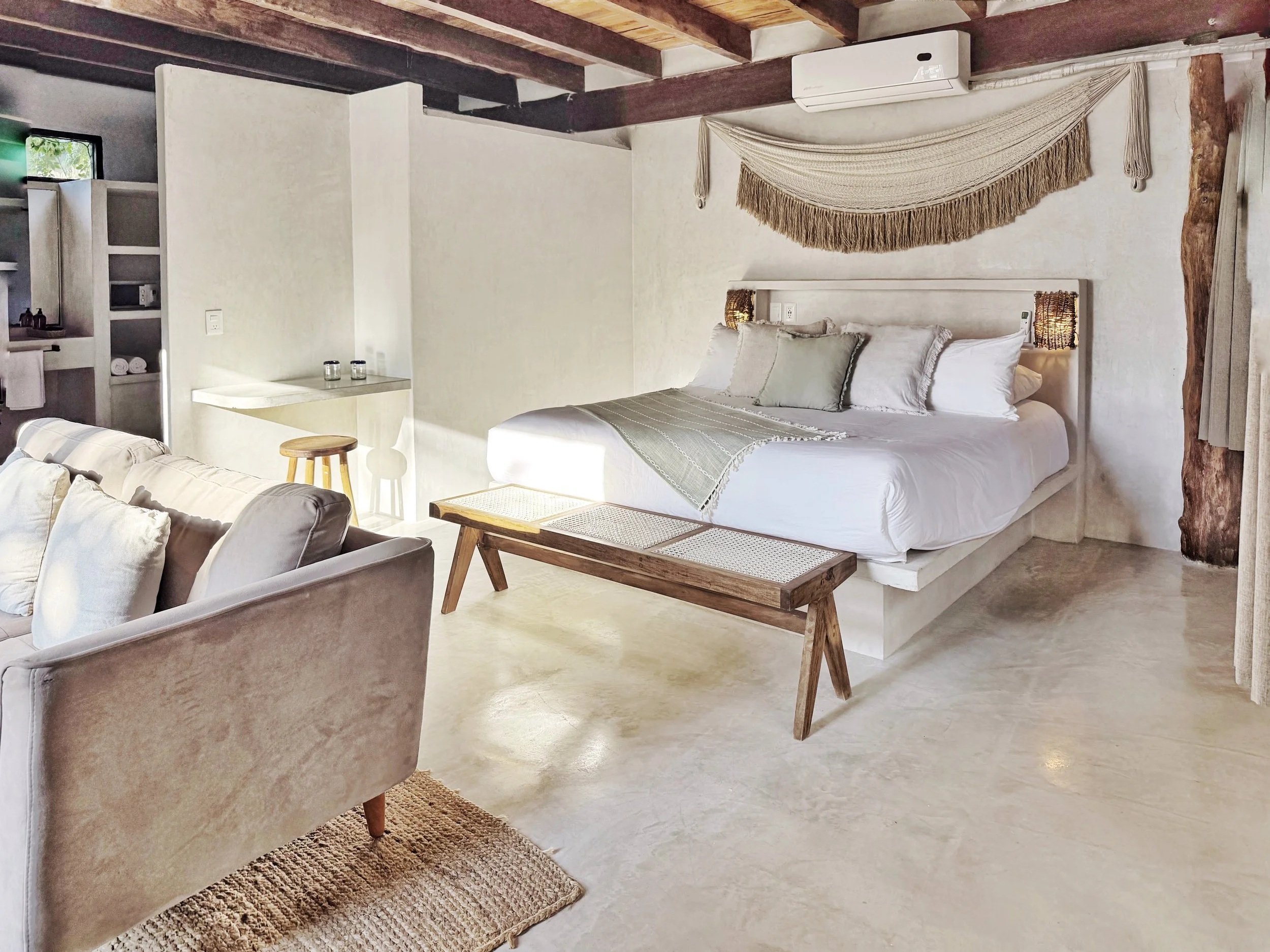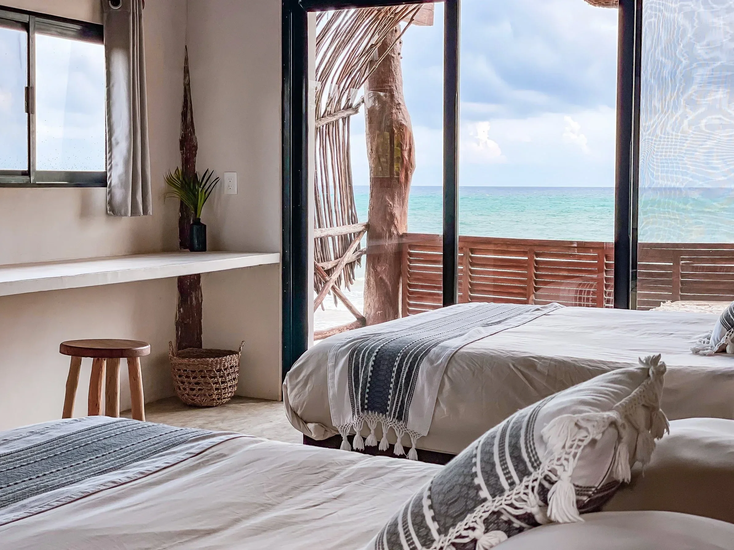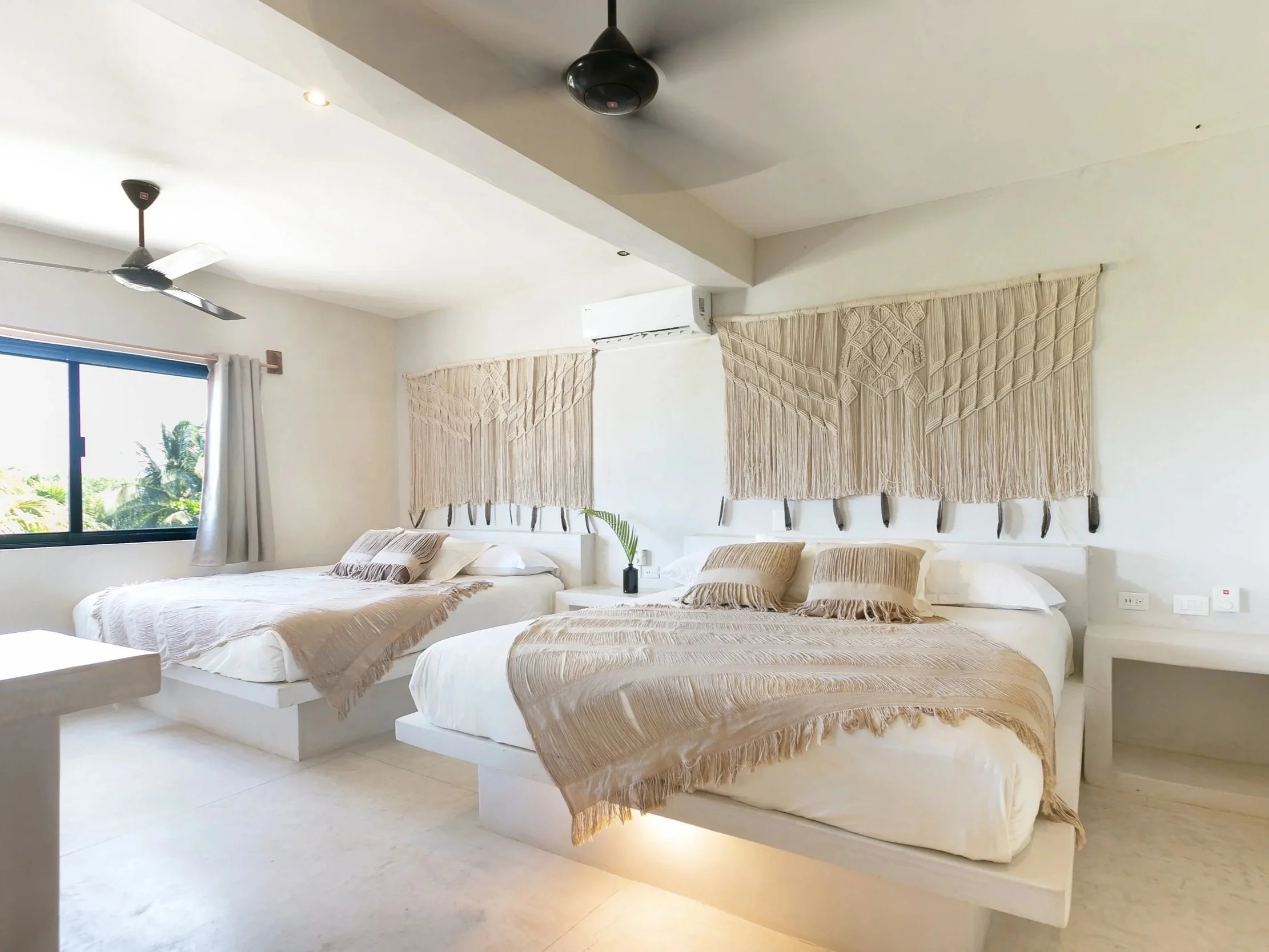 A large room set up to share. Each person has their own little space while sharing a large room with 2 other yogis. Rooms do not have a beach view and are slightly back in the property, but are comfortable and nice. One person per bed, 3 guests max!